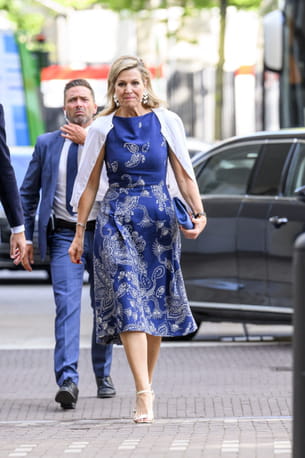 Le mardi 17 juin, la reine Máxima des Pays-Bas a assisté à la signature de l'accord des enseignants de musique au Conservatoire royal de La Haye. L'objectif de ce projet est d'ajouter davantage de musique en classe. Pour l'occasion, elle a dévoilé une robe sans manches de sa marque fétiche : Natan. Cette pièce bleu nuit était ornée d'un imprimé baroque brillant. Sur les épaules, elle portait un gilet blanc au cas où elle aurait froid tandis qu'une pochette bleu jean peaufinait ce look élégant et estival.