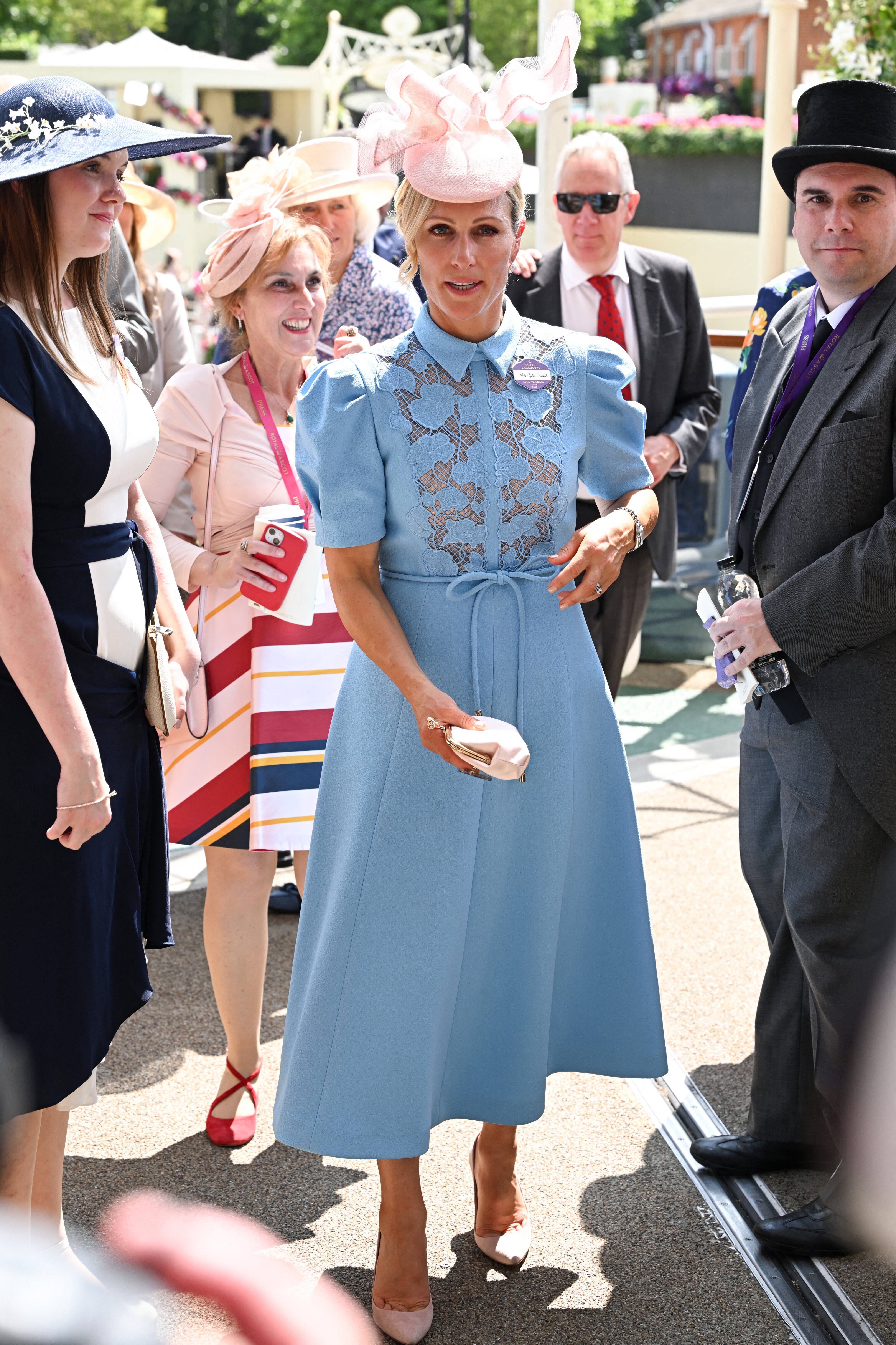 Zara Tindall a également fait forte impression lors de cet événement hippique. Elle n'a pas lésiné sur le style et a arboré une robe midi bleu ciel à manches courtes bouffantes et taille ceinturée. Le buste était orné de dentelle florale transparente, apportant une touche de féminité raffinée. La tenue était complétée par un ravissant bibi rose pastel décoré de volutes en tulle, assorti à une pochette et des escarpins nude. Ce look, à la fois chic et printanier, est idéal pour un événement prestigieux comme Ascot, alliant tradition britannique et sophistication moderne.