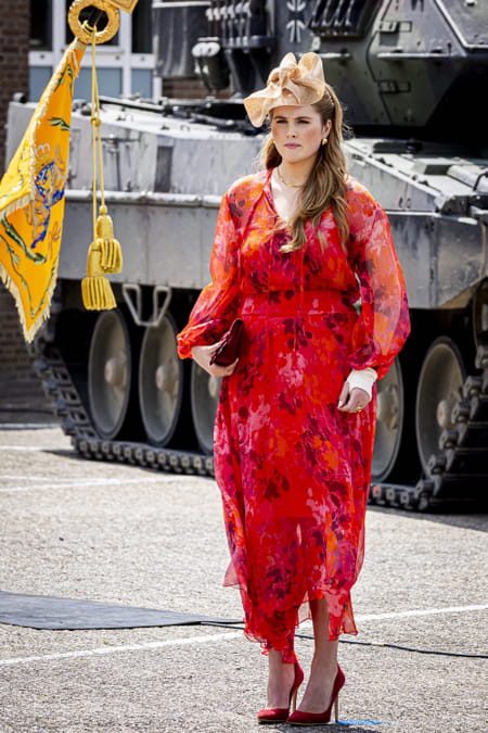 L'héritière du trône néerlandais accompagnait son père, le roi Willem-Alexander, lors de sa visite du régiment des Hussards Princesse Catharina-Amalia. Malgré son bras gauche en écharpe suite à un accident de cheval, la princesse de 21 ans est apparue dans un look très élégant, aux couleurs vitaminées qui sentaient bon l'été. La pièce phare de sa tenue était, assurément, sa robe midi rouge en mousseline de soie imprimée, issue de la collection couture printemps-été 2021 de la marque Natan. On aime les manches longues légèrement bouffantes et la ceinture qui marquait sa taille. Catharina-Amalia des Pays-Bas a complété son look avec les escarpins "Gianvito 105" signés Gianvito Rossi en suède rouge vif, ainsi que des boucles d'oreilles dorées de la marque LOTT.gioielli.