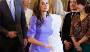 Letizia d'Espagne s'est affichée radieuse le 20 juin dernier afin d'assister à la cérémonie de clôture de l'année académique du Collège d'Europe. Son secret ? Opter pour une robe violette mettant en valeur son teint hâlé. Il s'agit d'un modèle Carolina Herrera qui se distingue par un col rond, des manches courtes nouées et une longueur midi. Look de saison que la souveraine a accessoirisé d'un sac à main nude Magrit, de slingbacks au bout pointu et de boucles d'oreilles en forme de goutte. La perfection incarnée !