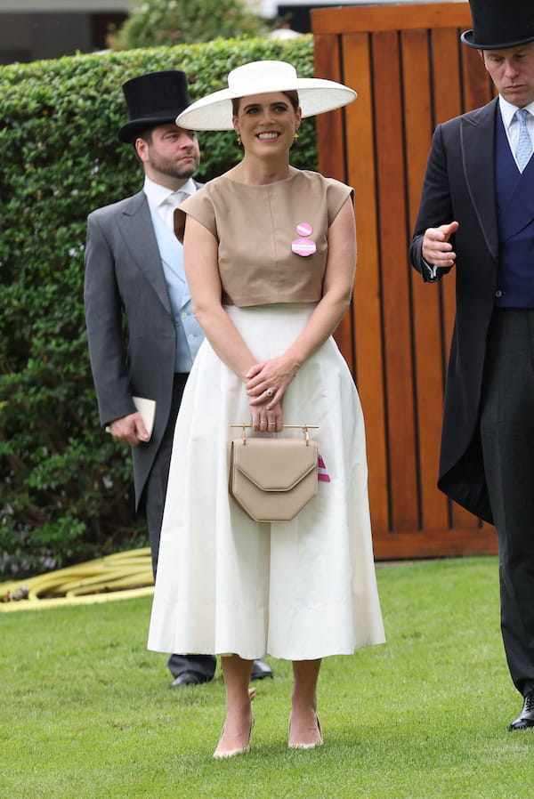 Eugénie d'York était présente sur la pelouse de la mythique course hippique Royal Ascot le 20 mai dernier. Et comme toujours, la princesse a fait preuve d'élégance en adoptant une sublime silhouette bicolore. Celle-ci se composait d'un haut court de couleur marron, d'une jupe blanche évasée qui mettait en valeur sa silhouette et d'un large chapeau assorti. Elle arborait également un sac à main en cuir beige M2Malletier en accord avec ses escarpins en daim. Un look digne d'une grande fashionista !