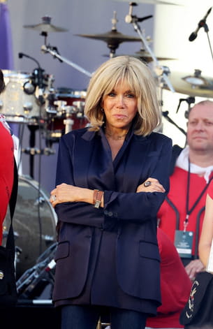 C'est à l'occasion d'un grand concert gratuit organisé dans la cour de l'Élysée pour la fête de la musique que Brigitte Macron a fait une apparition mémorable. Toujours impeccable, l'épouse du président de la République misait sur une silhouette bleu marine avec une veste de blazer satinée venant illuminer la tenue et une chemise de la même couleur qu'elle avait associé à un jean brut à la coupe skinny. Elle avait jeté son dévolu sur une imposante bague au majeur, une montre en cuir marron, un collier à plusieurs rangs et de discrètes créoles du côté des bijoux.