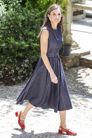 Letizia d'Espagne est apparue en Catalogne, ce lundi 23 juin, à l'occasion d'une visite officielle de l'abbaye de Montserrat. Sa tenue ? Une jolie robe en denim sans manches. Elle optait pour une version brut signée Carolina Herrera et caractérisée par une ceinture ton sur ton venant resserrer la taille, des surpiqures contrastantes et un effet évasé au niveau de la jupe. En guise d'accessoires, la souveraine choisissait du rouge puisqu'elle avait misé sur des babies vernies de chez Sézane qui rappelaient sa pochette portée à la main.