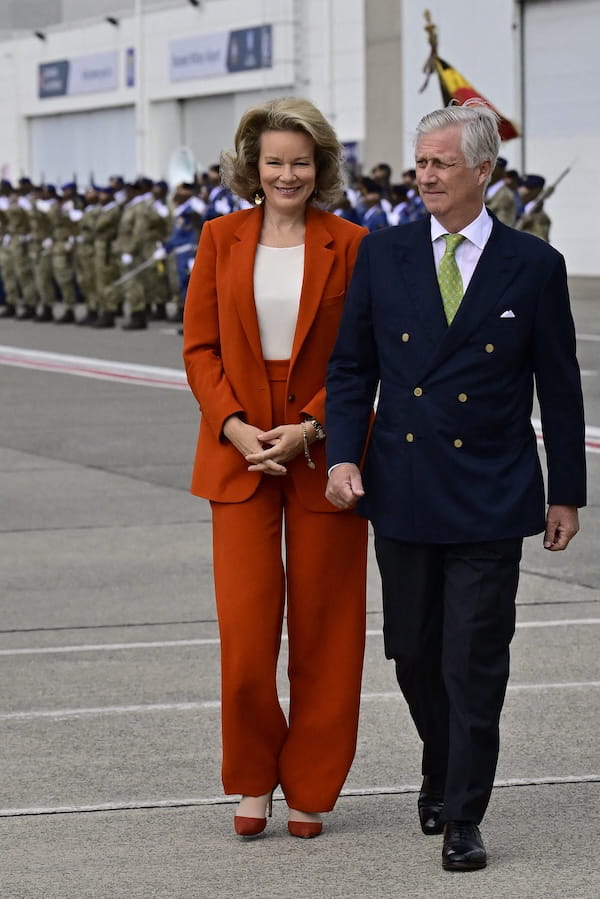 Philippe et Mathilde de Belgique se sont envolés pour le Chili le 23 juin dernier à l'occasion d'une visite d'État historique. Photographiée sur le tarmac de l'aéroport, la reine des Belges avait pour l'occasion sorti un ensemble de tailleur rouge orangé. Celui-ci se composait d'une veste de blazer associée à un top blanc et d'un pantalon taille haute aux jambes larges. Elle a accompagné sa tenue de bijoux dorés et d'une paire d'escarpins en daim de la même couleur que le costume pour une silhouette monochrome de haut vol.