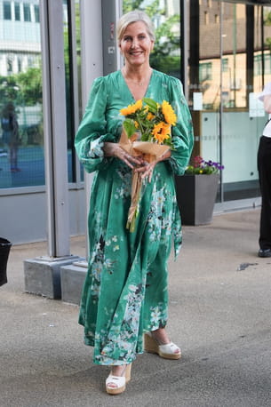 Dès son arrivée à l'école de danse classique Central School of Ballet de Londres, ce mardi 24 juin, Sophie d'Edimbourg a ébloui tout le monde dans une sublime robe portefeuille de chez Zimmerman. Il s'agissait du modèle Everley avec un imprimé fleuri sur fond vert, une longueur maxi et des manches bouffantes volumineuses. La duchesse avait également misé sur les bons accessoires pour compléter sa tenue estivale : des sandales compensées blanches et des bijoux minimalistes au fini doré. Un sans faute comme elle a l'habitude de faire !
