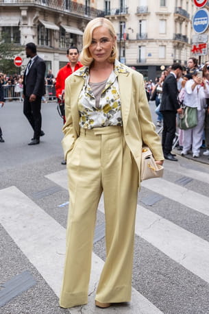 Parmi les invités présents ce mercredi 25 juin sur la mythique place des Victoires pour découvrir la collection Ami printemps-été 2026, il y avait Emmanuelle Béart. Elle était d'ailleurs superbe dans un ensemble de tailleur jaune pastel. Au programme : une veste de blazer oversize qu'elle portait ouverte sur une chemise imprimée de fleurs et un pantalon taille-haute à la coupe droite. L'actrice affiche également un sac en cuir crème à la main et des chaussures compensées pour booster sa silhouette. Le résultat est lumineux, pointu et trendy.