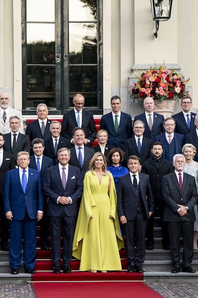 Maxima des Pays-Bas ne rate jamais une occasion de montrer qu'elle a du goût… Même sur une photo officielle réunissant les 32 chefs d'État des pays de l'OTAN ! Alors qu'ils ont tous fait dans la sobriété, la reine s'est fait remarquer en revêtant une tenue flamboyante. Elle brillait dans une combinaison Natan de nuance vert citron, dotée d'un décolleté plongeant, de jambes larges et de manches XXL donnant l'effet d'une cape. Une silhouette royale qu'elle a rehaussée par une broche en diamants ainsi que par des pendants d'oreilles scintillants.
