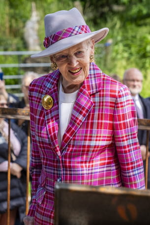 Le 25 juin dernier, pour l'inauguration d'un nouveau pont piétonnier au Pays des Légendes de Lejre, Margrethe de Danemark affichait une silhouette chic et élégante avec pour pièce maîtresse une veste de blazer recouverte de son imprimé préféré : les carreaux. La reine de 85 ans accordait ce modèle ultra coloré à une blouse blanche, à une jupe rouge et à un chapeau en feutre au liseré assorti. Du côté des accessoires, elle optait pour une broche XXL au fini doré en accord avec ses boucles d'oreilles. Un look qui lui ressemble.