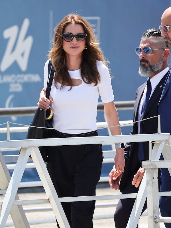 Après avoir attiré toute l'attention en robe Fendi lors du mariage de Jeff Bezos et de sa compagne Lauren Sanchez, la reine Rania de Jordanie s'est fait remarquer en quittant Venise ce samedi 28 juin. Son look d'aéroport ? Un top blanc doté d'une large découpe au niveau du décolleté et un pantalon large à élastique accessoirisé du sac cabas Bambola de chez Jacquemus, de larges lunettes de soleil et de boucles d'oreilles créoles en or. Et le moins que l'on puisse dire, c'est que cette silhouette informelle change de d'habitude !