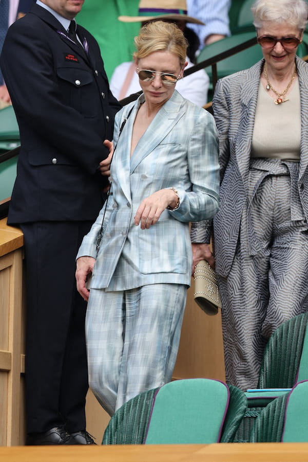 Cate Blanchett a pris place dans les tribunes de Wimbledon, ce mardi 1er juillet, afin d'assister au deuxième jour de la compétition. Elle s'est ainsi fait immortaliser dans un costume deux-pièces composé d'une veste à double boutonnage ainsi que d'un pantalon droit à la coupe assez large. Cet ensemble au motif prince de Galles, fabriqué en soie, est une pièce issue des collections de la maison Armani. À ce look à la fois chic et raffiné venait s'ajouter une paire de lunettes de soleil aviateurs aux verres jaunes. La classe !