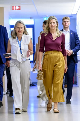 Ce mardi 1er juillet, Maxima des Pays-Bas s'est rendue au centre médical de Nimègue à l'occasion d'une visite concernant la réduction des déchets. L'occasion pour elle de conjuguer une nouvelle fois deux nuances vives avec une aisance plus que remarquable. Elle avait ainsi misé sur un polo violet aux manches 3/4 glissé à l'intérieur d'un pantalon moutarde avec une ceinture intégrée et des jambes larges arrivant au-dessus de la cheville. Et pour sublimer sa tenue du jour, la reine arborait un mini sac à franges et des ballerines à brides effet paille.