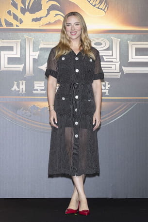 Scarlett Johansson était divine à l'avant-première coréenne du film Jurassic World : Renaissance qui se tenait le 1er juillet dernier. Elle portait pour l'occasion une robe chemise noire à petits pois blancs. Il s'agit d'un modèle semi-transparent avec des manches courtes, des boutons contrastants et une doublure courte qui dévoile ses jambes sublimées d'une paire d'escarpins rouges en satin signés Prada. La création est également nouée à la taille, soulignant ainsi à la perfection la silhouette de l'actrice américaine.