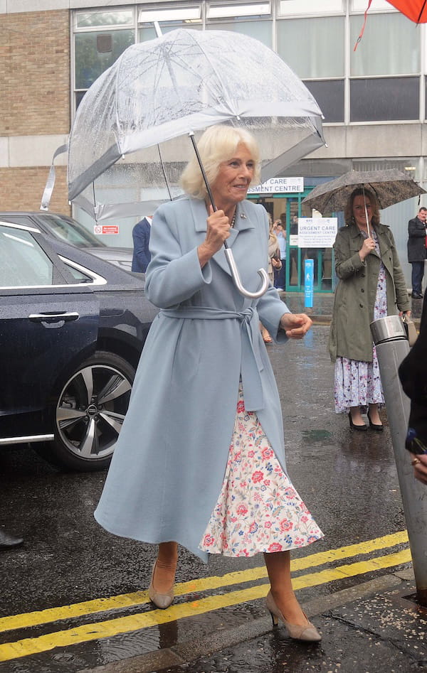 Robe à fleurs et manteau bleu ciel, la reine Camilla resplendit même sous la pluie !