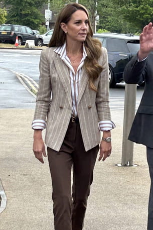 Alors qu'elle est allée à l'hôpital de Colchester pour rendre visite aux malades du cancer, la princesse de Galles a opté pour une allure intemporelle et épurée qui a fait sensation. Elle arborait une chemise blanche à rayures marron Ralph Lauren surmontée d'un blazer beige également rayé et griffé Blazé Milano. Pour compléter sa tenue, Kate Middleton avait choisi un pantalon chocolat à la coupe cigarette ainsi qu'une paire de baskets Veja. Cerise sur le gâteau ? Ses bijoux (montre + boucles d'oreilles) de la marque Cartier.