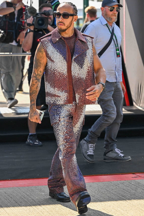 Pour le premier jour du Grand Prix de Grande-Bretagne 2025, Lewis Hamilton a fait sensation en arrivant dans une tenue à l'effigie du drapeau britannique. Cette dernière comprenait une veste sans manches ouverte et un pantalon aux jambes évasées agrémenté de poches plaquées sur les côtés, tous deux incrustés de strass rouge, bleu et blanc. Un ensemble audacieux qu'il a choisi de combiner avec un débardeur en maille bordeaux, des bottes noires en cuir et des solaires épaisses à la monture rectangulaire.