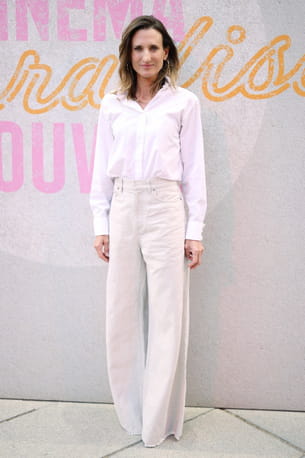 Les célébrités ont rivalisé d'élégance au deuxième jour du festival Cinéma Paradiso mais une apparition a particulièrement captivé l'assistance : celle de Camille Cottin. L'actrice de 46 ans s'est illustrée dans une tenue plus que lumineuse. Pour l'occasion, elle avait misé sur une chemise blanche à manches longues rentrée à l'intérieur d'un jean beige mettant sa silhouette longiligne en valeur. Ce dernier était tellement large et long qu'il cachait ses chaussures alors que de simples créoles dorées venaient accessoiriser l'ensemble.