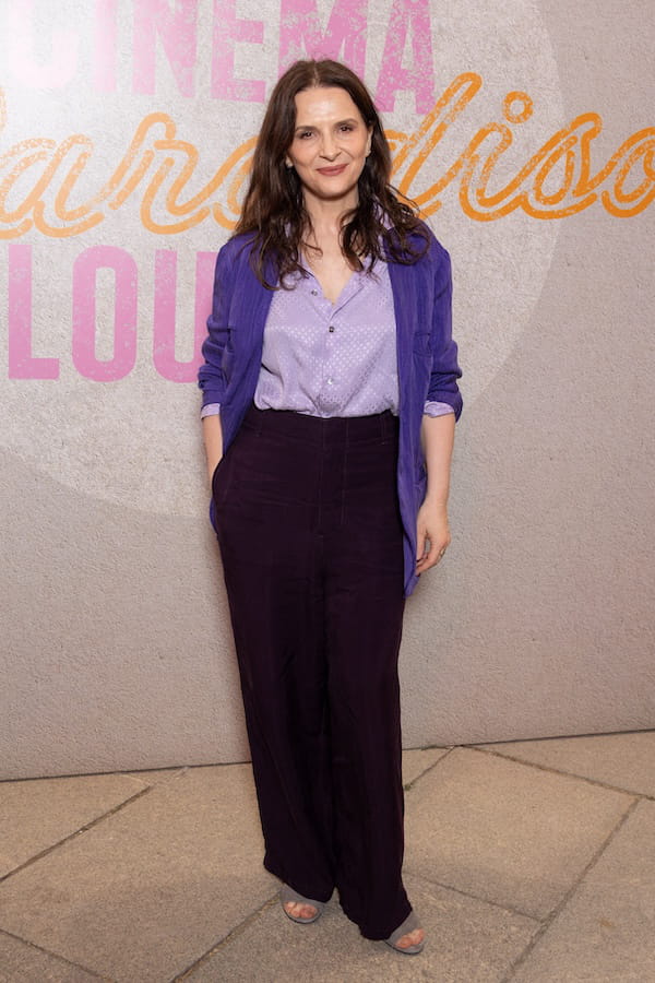Ce samedi 5 juillet, Juliette Binoche a fait une apparition surprise au Cinéma Paradiso Louvre pour remettre le prix d'interprétation de Cannes à Wagner Moura. Et la célèbre actrice française est apparue dans une silhouette aussi chic que cool : une chemise lilas en satin qu'elle portait avec un cardigan violet par-dessus et un pantalon large effet velours de couleur burgundy. La touche finale de ce look ? Une paire de mules à talons en daim gris apportant une touche de contraste à cette allure 100% violette.