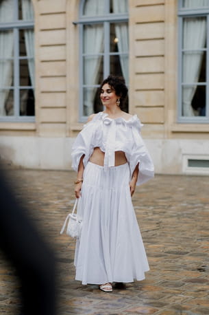Camelia Jordana faisait partie des personnalités invitées au défilé de la collection haute couture printemps-été 2026 de la maison Patou. Pour l'occasion, l'actrice et chanteuse avait revêtu un ensemble blanc à l'esprit bohème qui lui allait à ravir. Au programme ? Un haut aux épaules dénudées avec des volants structurant le tout, combiné à une jupe vaporeuse qui dévoilait une paire de sandales à talons. À sa tenue délicate et raffinée, elle a également ajouté un sac immaculé et des bijoux maximalistes.