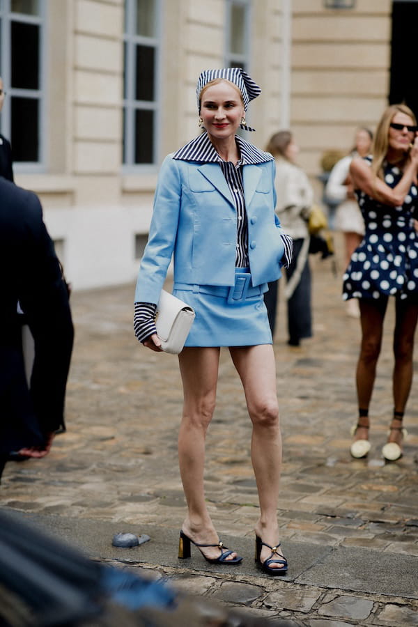 Direction la Maison de la Chimie à Paris pour Diane Kruger qui assistait à la présentation de la collection printemps-été 2026 de Patou ce dimanche 6 juillet. Pour son look, l'actrice allemande s'était inspirée des années 60 en choisissant un ensemble bleu composé d'une veste à boutons et d'une mini-jupe dotée d'une ceinture XXL. Elle affichait également une chemise au large col imprimée de rayures noires et blanches et un bandana assorti dans les cheveux. Côté accessoires, c'est pour un sac blanc et des sandales à talons que la star a craqué.