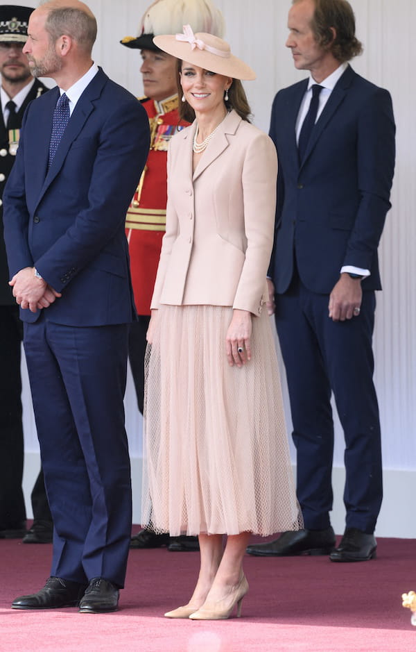 Pour la procession en calèche organisée à Windsor pour la visite d'Etat du couple présidentiel français, ce mardi 8 juillet, Kate Middleton a repris les codes du style "New Look". Elle avait glissé sa silhouette dans un look beige Dior composé d'une veste marquant la taille et d'une jupe en tulle qui laissait apparaître des escarpins en daim. Le parfait look monochrome qu'elle accessoirisait avec un mini chapeau placé en biais sur sa tête et de somptueux bijoux en perles. Et c'est la première fois que la princesse de Galles affichait une tenue de la maison de couture française !