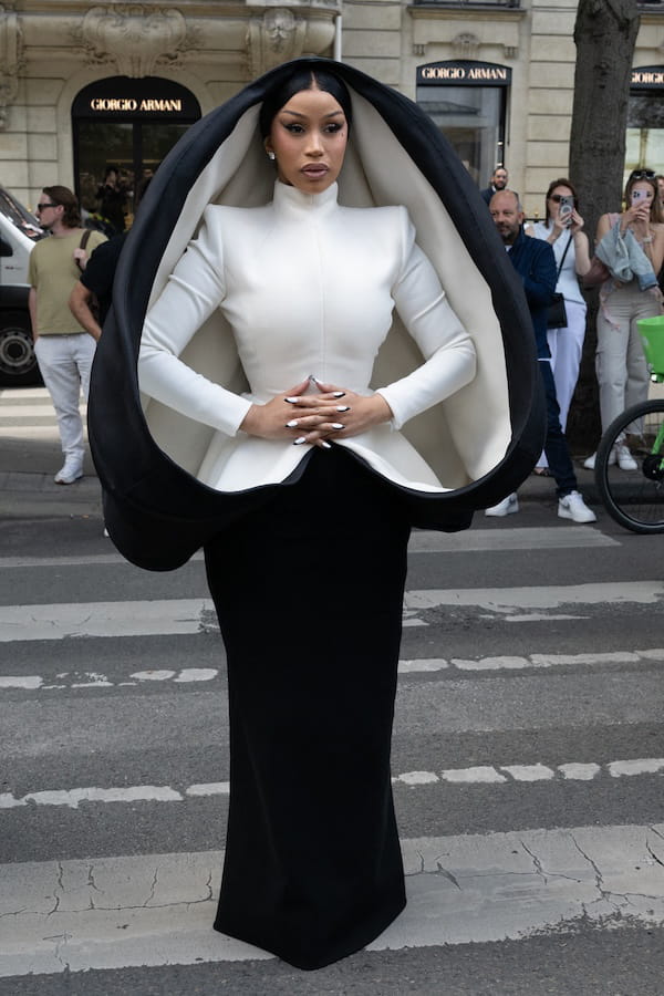 Cardi B irradie à chaque fois qu'elle passe quelque part et ce mardi 8 juillet n'a pas fait exception à la règle. Fidèle à son style phénoménal, la rappeuse américaine est apparue au dernier défilé Haute Couture de Stephane Rolland dans une robe blanche à l'intérieur et noire à l'extérieur. Sa coupe originale était marquée par une capuche XXL qui partait de ses hanches pour tenir sur sa tête. Et parce qu'elle se suffisait à elle-même, la pièce en question avait simplement été associée à des puces d'oreilles scintillantes.