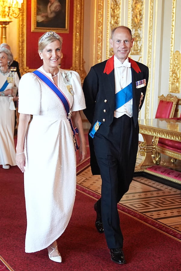 La duchesse d'Edimbourg était, elle aussi, présente ce mardi 8 juillet à l'imposant banquet organisé en marge de la visite d'État du couple présidentiel français. Et quoi de mieux pour l'occasion que de porter une robe de la marque Suzannah London ? La pièce immaculée présentait des sequins ton sur ton, des manches courtes bouffantes et un bas asymétrique. Sophie Rhys-Jones était également coiffée d'un fin diadème surmonté d'une aigue-marine qui a appartenu à sa défunte belle-mère, la reine Elizabeth II.