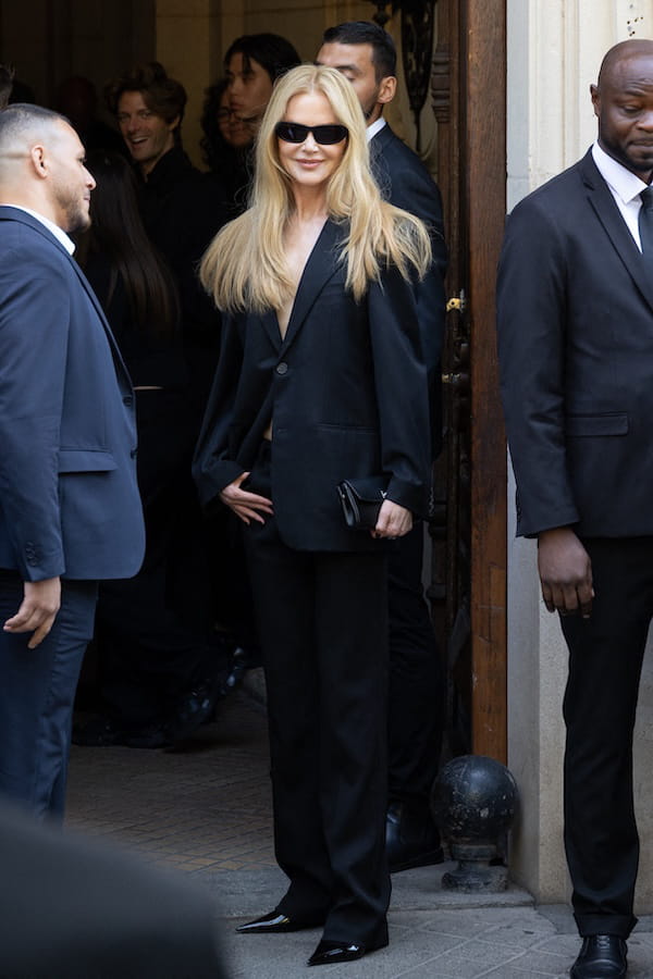 Invitée au défilé haute couture automne-hiver 2025-2026 de Balenciaga, Nicole Kidman a fait sensation dans son total look noir de jais ultra élégant. Elle était parée d'un ensemble de tailleur constitué d'un blazer oversize à simple boutonnage et d'un pantalon parfaitement coupé. La touche sexy ? L'absence de haut ou de soutien-gorge sous la veste de la star internationale. Et que dire de ses lunettes de soleil noires, de sa petite pochette et de ses maxi escarpins vernis qui rehaussaient son allure…