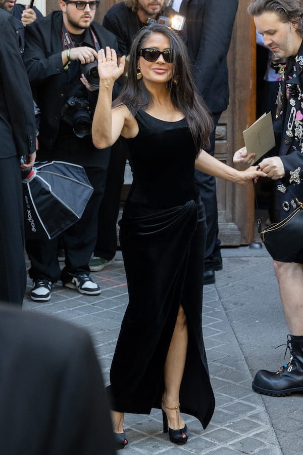 Nombreuses sont les célébrités qui étaient venues au défilé haute couture automne-hiver 2025-2026 de Balenciaga, ce mercredi 9 juillet, pour le dernier show de Demna. Parmi elles, Salma Hayek avait fait un choix vestimentaire glamour et distingué en se tournant vers une robe sombre en velours, caractérisée par une fente avant et un effet plissé qui mettait en valeur sa taille de guêpe. Cette pièce s'accompagnait de lunettes de soleil, de boucles d'oreilles en forme de cœur et d'escarpins à talons hauts avec une chaîne autour de la cheville pour un effet "waouh".