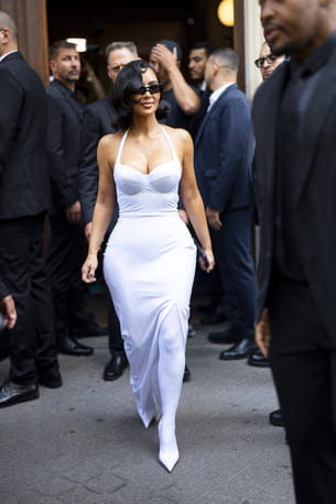 À peine arrivée sur les lieux du défilé haute couture automne-hiver 2025-2026 de Balenciaga, Kim Kardashian s'est fait photographier à de multiples reprises. Sur ces clichés, la star du petit écran apparaît dans une robe blanche qui moule chaque partie de son corps. Il s'agit d'une création de la maison espagnole dotée d'une fente sur le côté, d'un décolleté push-up et d'un dos largement dévoilé. Elle la porte en association avec une paire de collants/escarpins 2 en 1 ainsi qu'avec des lunettes futuristes insufflant une touche pointue à son allure.