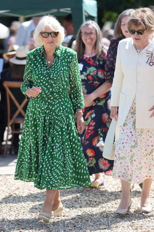 Camilla Parker-Bowles s'est affichée dans une création estivale avec laquelle on a l'habitude de la voir à l'occasion d'une visite à la Wiltshire Community Foundation ce jeudi 10 juillet. Le modèle ? Une robe-chemise verte parsemée de pois blancs de différentes tailles avec une large ceinture ton sur ton et un bas entièrement plissé. Pour l'accessoiriser, la reine consort a opté pour des chaussures compensées en daim beige ainsi qu'une paire de lunettes de soleil marron. On pouvait également apercevoir des bijoux en or à ses oreilles, autour de son cou et à ses poignets.