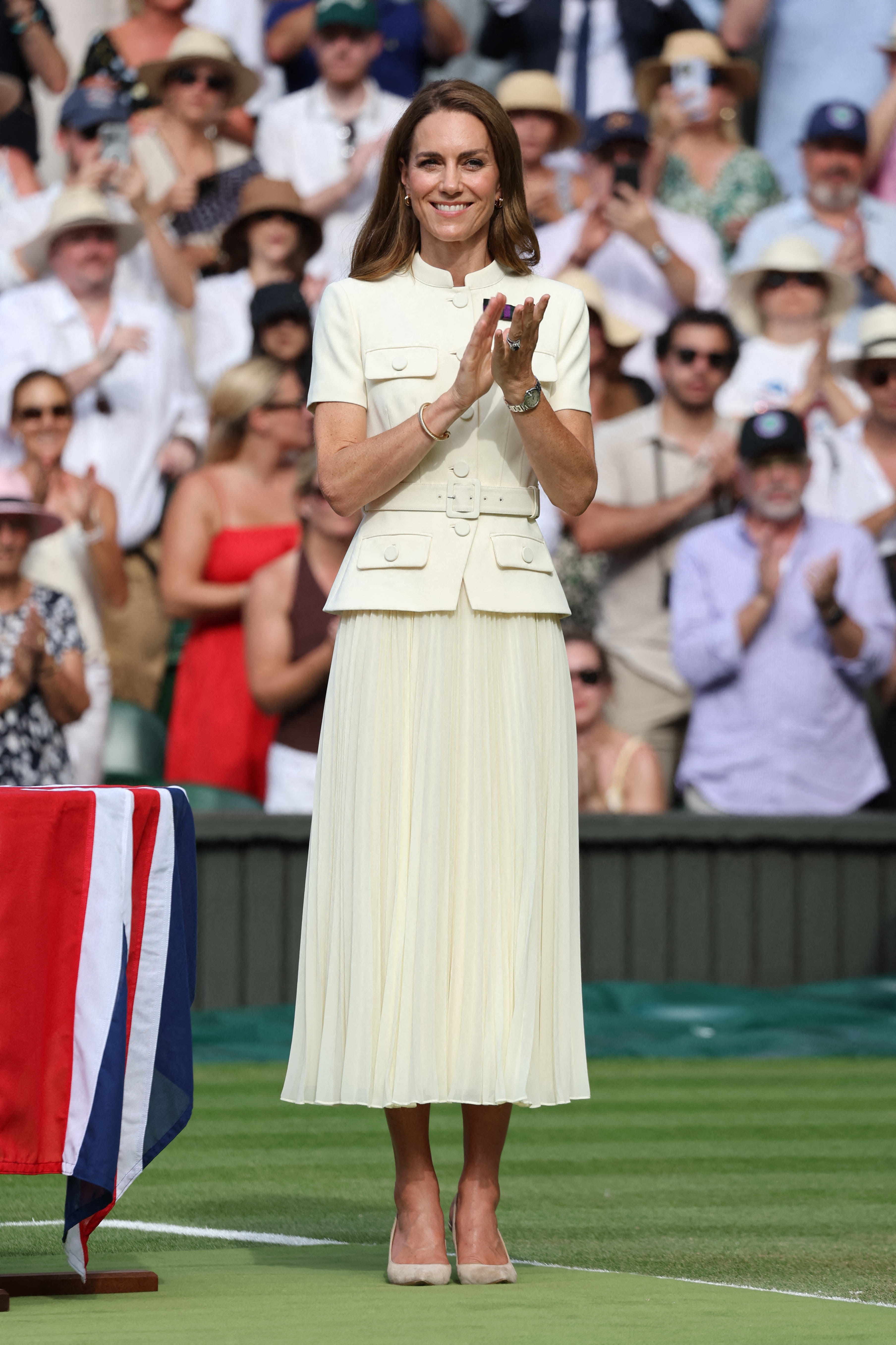 Sur la pelouse de Wimbledon, Kate Middleton affichait une allure élégante et raffinée dans un ensemble monochrome jaune pastel. Elle portait un haut structuré à manches courtes avec un col montant, rehaussé de poches plaquées et d'une ceinture intégrée, créant une silhouette cintrée. Ce haut était assorti à une jupe midi plissée, qui lui conférait un mouvement fluide et gracieux. Des escarpins de couleur nude complétaient sa tenue. L'ensemble de son look était à la fois chic et sobre. Une véritable réussite !