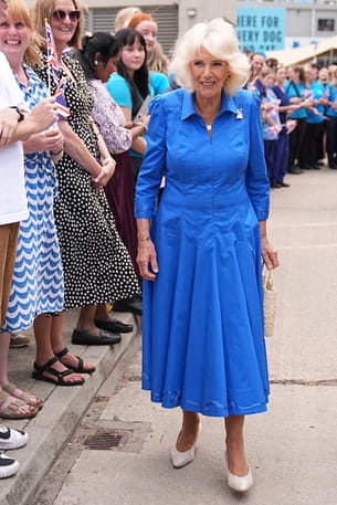 Camilla Parker Bowles a été aperçue portant une élégante robe midi d'un bleu vif, caractérisée par un col chemise et un décolleté zippé. Les manches étaient longues et la jupe évasée, lui conférant une silhouette flatteuse et classique. Elle avait accessoirisé sa tenue d'une broche dorée discrète épinglée sur le revers de sa robe. À ses pieds, elle avait choisi des escarpins nude à petit talon, et tenait un petit sac en paille dans sa main. L'ensemble de son look était à la fois chic et approprié pour un événement en journée.