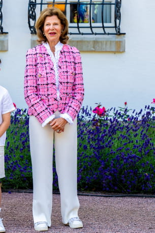Pour les 48 ans de sa fille, Victoria de Suède, Sylvia de Suède affichait un look rajeunissant. Elle portait une veste en tweed rose vif, ornée de carreaux noirs et de boutons dorés, qui apportait une touche de couleur audacieuse à sa tenue. Le col et les poignets de la veste étaient rehaussés d'un liseré blanc très chic. Dessous, elle avait opté pour un chemisier blanc à volants, et le tout était associé à un pantalon large de couleur crème. Pour une touche de confort et de modernité, elle avait choisi des baskets blanches, créant un contraste intéressant avec la veste plus formelle.