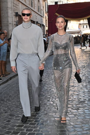 À Rome pour la Fashion Week, le joueur de Manchester City, Erling Haaland est apparu au côté de sa compagne, Isabel Johansen, et le moins que l'on puisse dire c'est que tous les objectifs se sont braqués sur eux. Il portait un ensemble monochrome gris clair, composé d'un pull à col roulé à manches longues et d'un pantalon de costume droit. Sa copine arborait une robe longue en maille transparente, laissant apparaître un ensemble de lingerie noire, composé d'un soutien-gorge et d'une culotte taille haute.