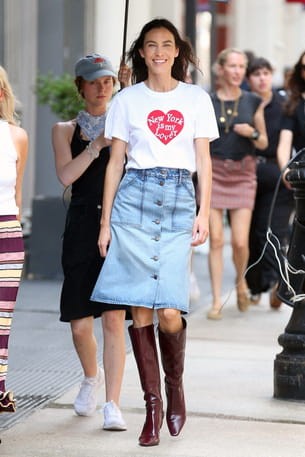 À New York, Alexa Chung a été aperçue dans une tenue décontractée, mais stylée, à l'image de son statut de modeuse. Elle portait un t-shirt blanc à message avec un cœur sur la poitrine sur lequel était écrit "New York is my Lover". Mais la pièce maitresse était sans aucun doute cette jupe midi en jean de couleur denim clair. La jupe était dotée d'une coupe évasée et était boutonnée sur le devant, ajoutant une touche classique et intemporelle. Un look confortable et féminin qui est parfaitement adapté à la saison.