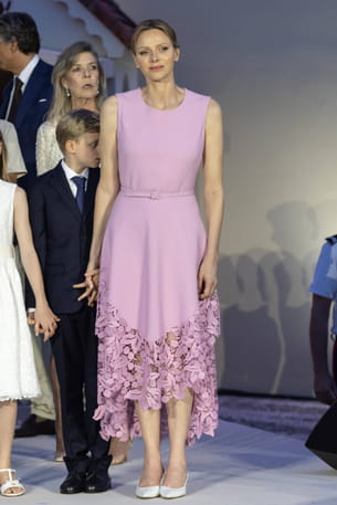 Pour célébrer en famille les 20 ans de règne du prince Albert de Monaco, Charlène de Monaco a joué la carte de la séduction. Pour son époux, elle est apparue dans une robe élégante de couleur rose bonbon. La tenue Oscar de la Renta, ajustée à la taille par une fine ceinture, se distinguait par sa jupe asymétrique, plus courte devant, et son ourlet orné d'une magnifique dentelle ajourée ton sur ton. Ce détail apportait une texture riche et sophistiquée. Elle avait complété son look avec des escarpins blancs Gianvito Rossi.