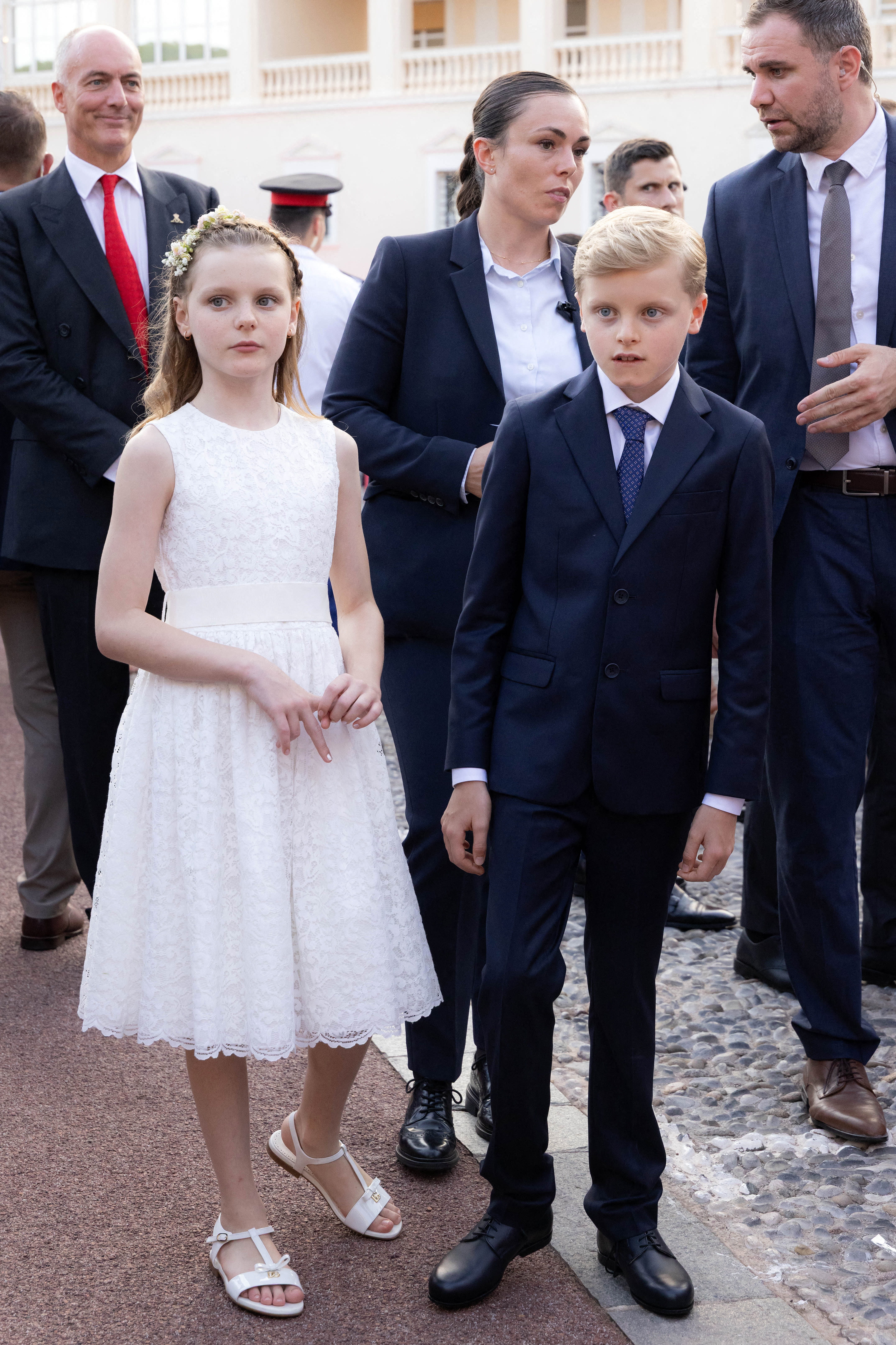Ce 19 juillet était une date importante pour la famille princière qui s'était rassemblée à Monaco. Le prince Albert II fêtait ses 20 ans de règne. Pour l'occasion, les enfants étaient présents plus stylés que jamais. Gabriella portait une jolie robe blanche sans manches, de longueur mi-mollet, parfaite pour une cérémonie. La robe était confectionnée dans une belle dentelle, lui conférant un aspect délicat et classique. Un bandeau fin, orné de petites fleurs était posé sur ses cheveux. À ses côtés, Jacques était vêtu d'un costume bleu marine qui comprenait une veste bien coupée et un pantalon assorti. Il portait une chemise blanche et une cravate à motifs bleus et blancs, qui ajoutait une touche de sophistication.