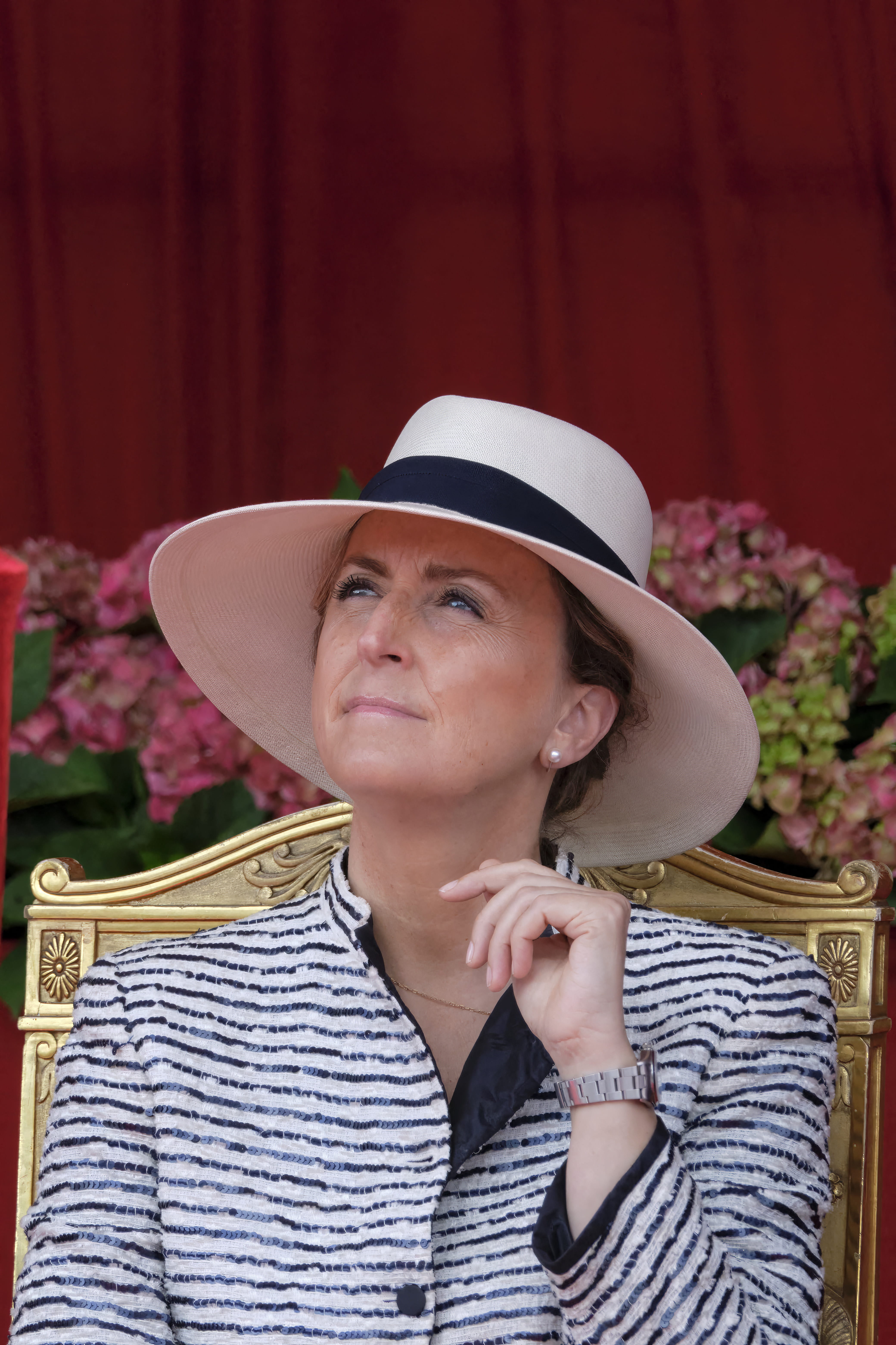 La princesse Claire de Belgique était assise dans la tribune royale pour admirer le défilé militaire de la fête nationale belge. Elle avait misé sur l'élégance en tous points avec une veste de tailleur à rayures horizontales alternant le noir et le blanc, ce qui créait un motif graphique chic et intemporel. L'accessoire principal de son look était un large chapeau de paille de couleur claire, orné d'un ruban bleu marine. Ce chapeau ajoutait une touche de glamour à son look, soulignant son allure estivale.