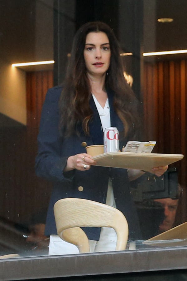 Anne Hathaway a été photographiée en train de tourner des scènes du Diable s'habille en Prada 2 dans une cafétéria de New York le 23 juillet dernier. Elle affichait une allure à la fois chic et décontractée à l'image de son rôle dans le film. Elle portait une veste de blazer bleu marine à double boutonnage, ornée de boutons dorés, qui apportait une touche classique et structurée à sa tenue. Sous la veste, elle avait opté pour une blouse blanche. Elle avait également enfilé un pantalon assorti qui créait un contraste harmonieux avec le blazer foncé.