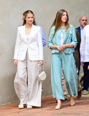 Ce jeudi 24 juillet, Leonor et Sofia d'Espagne se sont rendues en Catalogne. Pour cette sortie officielle, les deux sœurs ont décidé de s'habiller avec des tenues presque similaires composés de pantalons larges, de t-shirts blancs et de blazer. La princesse Leonor arborait un ensemble en lin blanc de la marque Mango. Le tout étant rehaussé d'espadrilles compensées, soulignant un style méditerranéen épuré. De son côté, sa cadette a préféré opté pour un ensemble coordonné turquoise présentant un pantalon ample et une veste courte boutonnée de la maison Rivera.
