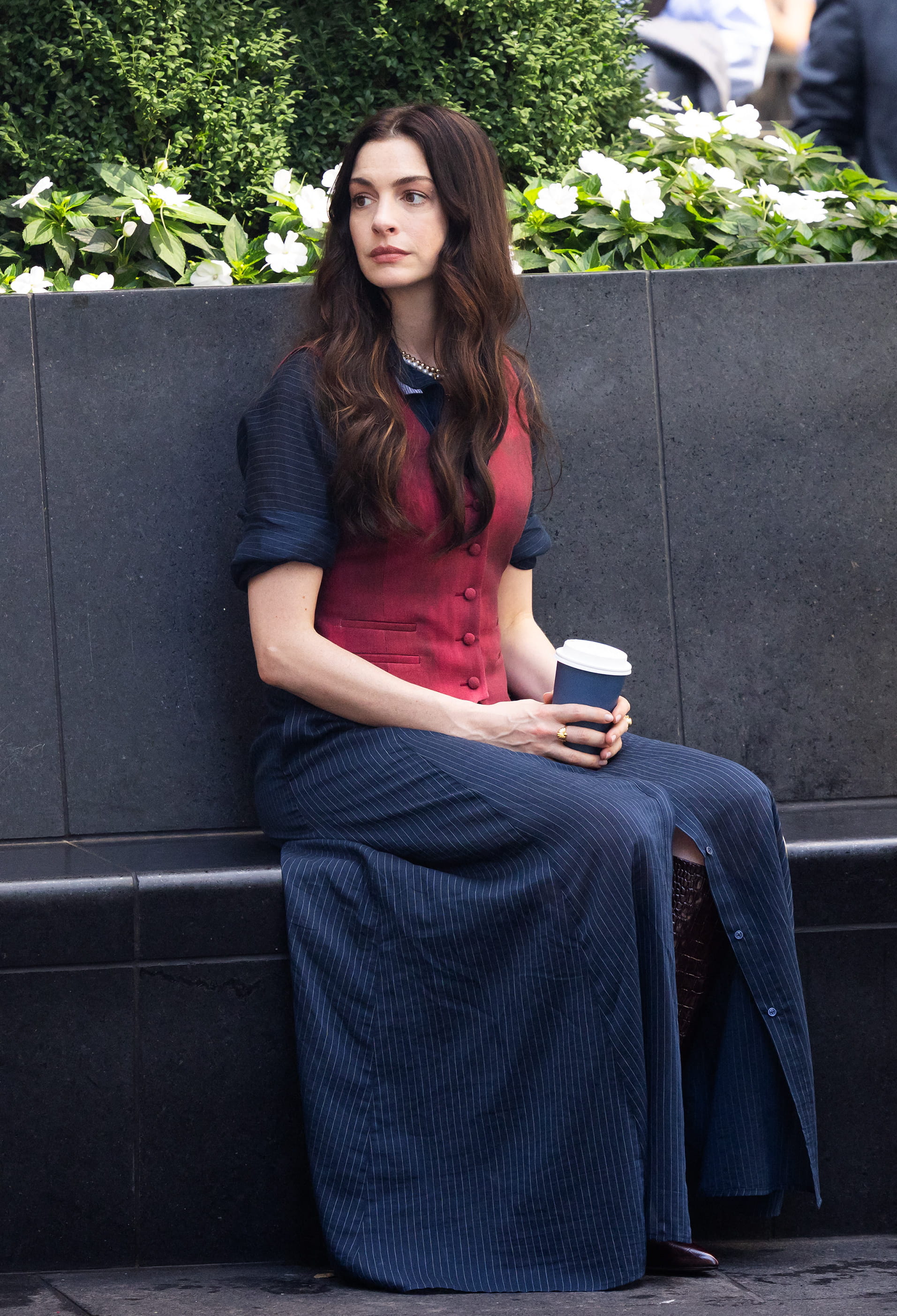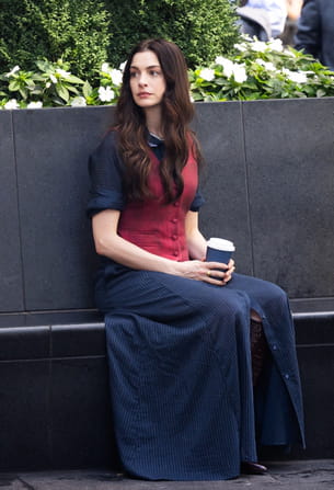 Sur le tournage du film Le Diable s'habille en Prada 2, Anne Hathaway a été vue dans un ensemble un peu décalé qui collait parfaitement bien à son rôle. Elle portait un chemisier bleu marine à rayures et y avait ajouté une longue jupe assortie, dotée d'une fente jusqu'aux genoux, révélant des bottes marron effet croco. Par dessus sa chemise, elle avait enfilé un gilet sans manches d'un rouge profond qui se fermait par plusieurs petits boutons sur le devant. Un look sérieux et affirmé comme on les aime !