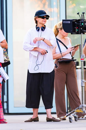 Le 29 juillet dernier, Katie Holmes est devenue réalisatrice pour sa nouvelle trilogie de longs métrages, Happy Hours. Pour l'occasion à New York, elle affichait un look décontracté et pratique. Elle portait une chemise oversize à rayures verticales fines blanches et noires, avec des manches retroussées, Cette chemise était associée à un pantalon large noir, de coupe cropped qui arrivait à mi-mollet, créant une silhouette moderne. À ses pieds, elle avait choisi des mocassins plats de couleur marron. Ses cheveux étaient partiellement attachés sous une casquette de baseball noire.