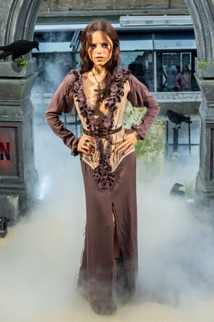 Lors de la promotion de la série Wednesday à Paris, Jenna Ortega a une nouvelle fois affirmé son statut d'icône goth-glam. Elle portait une longue robe victorienne, dans des tons bruns et beiges, rehaussée de volants et d'un profond décolleté encadré par un col. Cintrée à la taille par une ceinture à boucle dorée, sa silhouette structurée évoquait une esthétique sombre et théâtrale, parfaitement dans l'esprit de son personnage. Un collier croix surdimensionné et une bague imposante venaient accentuer l'ambiance mystérieuse et occulte de ce look.