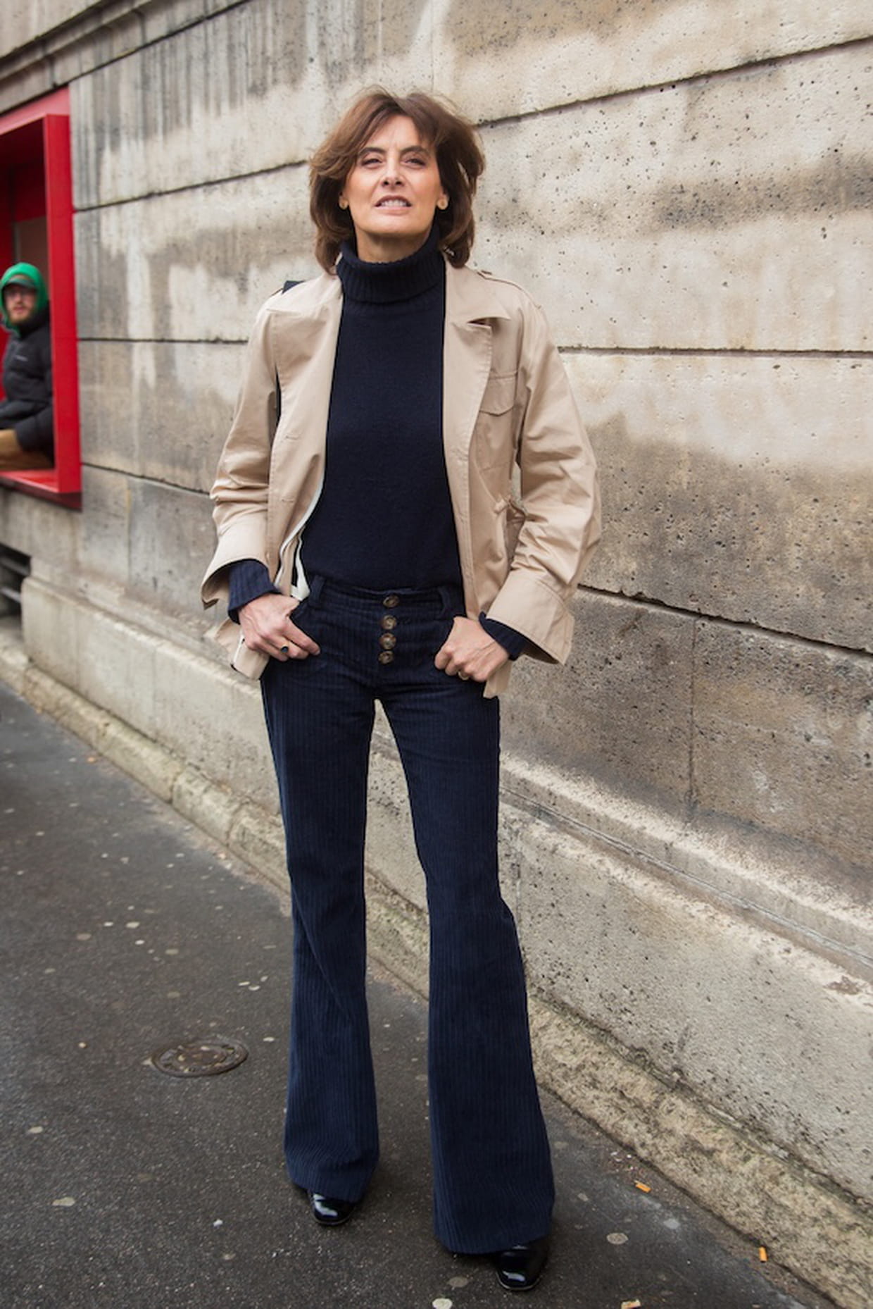 Ines de la Fressange en trench court et col roulé bleu marine lors de son arrivée au show Giambattista Valli lors de la Fashion Week automne-hiver 2020-2021, le 2 mars 2020.