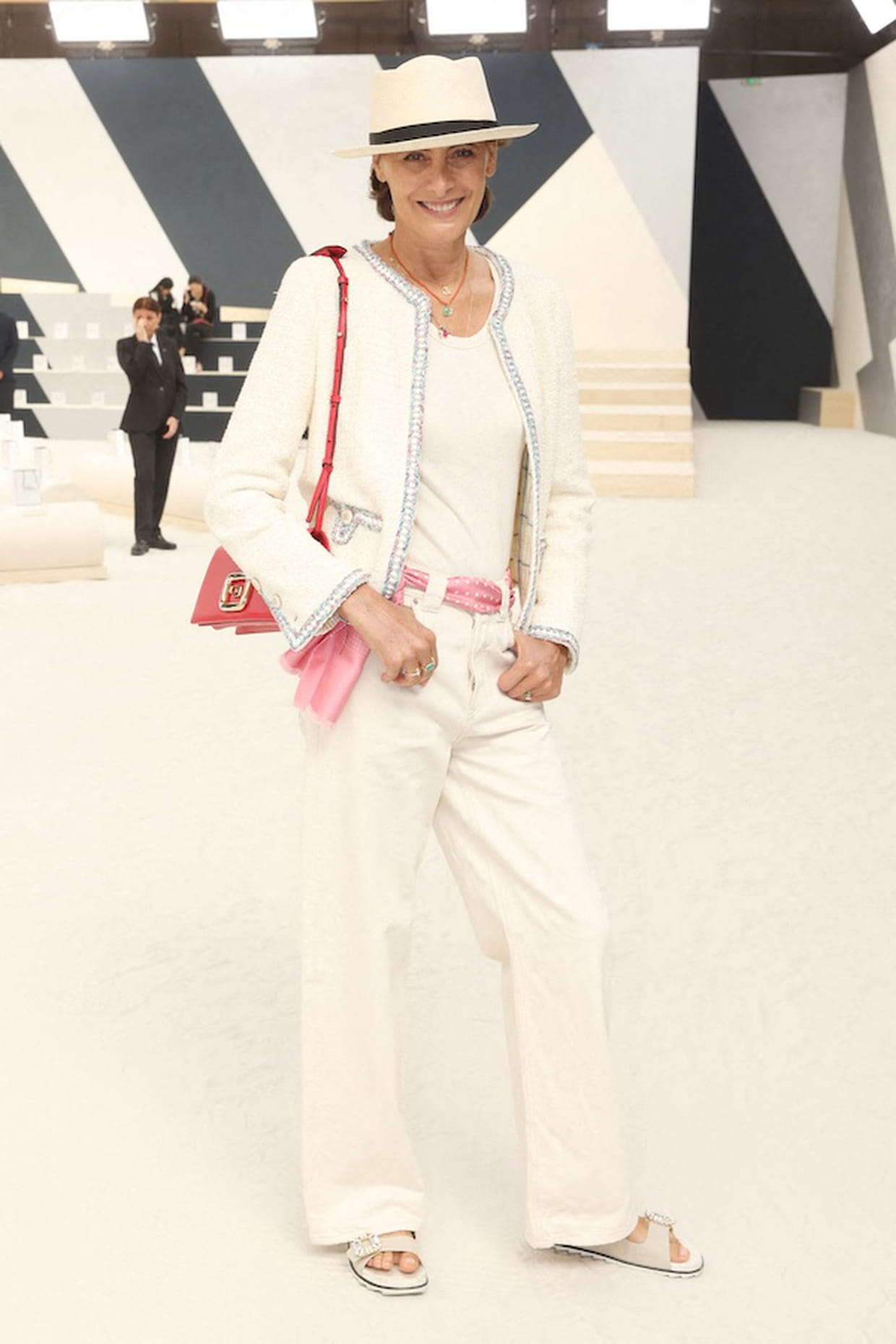 Ines de la Fressange en total look crème avec une veste en tweed au défilé Chanel lors de la Fashion Week Haute Couture de Paris le 5 juillet 2022.