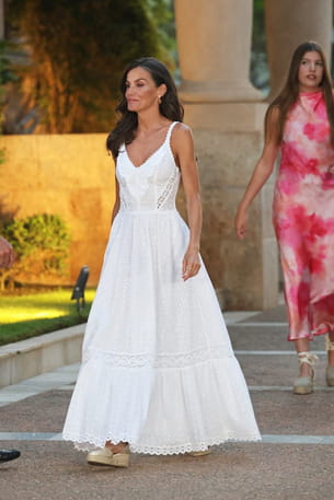 Letizia d'Espagne a misé sur la simplicité lors d'un dîner organisé au sein du somptueux palais de Marivent le 4 août dernier à Palma de Majorque. Son choix de tenue s'est en effet porté sur une pièce épurée : une longue robe blanche en broderie anglaise du créateur Tony Bonet. Parfaite pour l'occasion, elle se distingue par un décolleté en V agrémenté de volants et par une ceinture intégrée à fleurs. Et la discrétion était de mise pour les accessoires également, puisque la souveraine optait pour des boucles d'oreilles dorées ainsi que pour une paire d'espadrilles.