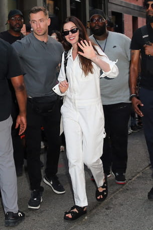 Anne Hathaway tourne actuellement la suite du film Le Diable s'habille en Prada à New York et c'est d'ailleurs en quittant le set qu'elle a été photographiée avec un total look blanc mêlant chic et décontraction. La star du cinéma s'est illustrée dans une combinaison pantalon blanche en denim qui se caractérise par des poches plaquées sur le devant et des manches longues. Elle a accompagné cette pièce immaculée d'une paire de sandales griffées Chanel, d'un sac à main en cuir recouvert de clous et de solaires rectangulaires.