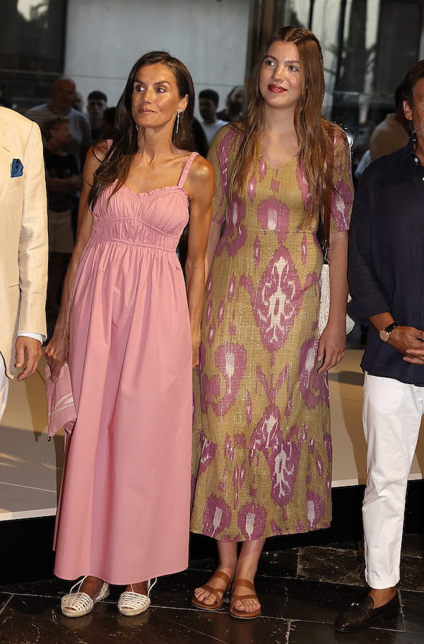 Le 5 août dernier, Letizia d'Espagne, Felipe VI et leurs filles Leonor et Sofia ont visité l'exposition "Paysage-Miro" de Joan Miro à La loge de Palma à Majorque. Un rendez-vous culturel pour lequel l'infante espagnole s'était lovée dans une silhouette ensoleillée. Au programme de celle-ci ? Une robe mi-longue dans les tons marron et rose de la marque Babbaki. Avec ses manches courtes bouffantes et son effet volonté en bas, cette pièce offre une allure à la fois chic et décontractée à la jeune femme de 18 ans. Sans parler de son sac en crochet et de ses sandales en cuir !