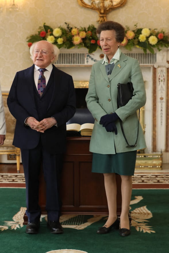 À Dublin, la princesse Anne dégaine son look signature en tailleur-jupe vert