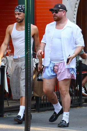 Le samedi 16 août, Sam Smith a été photographié dans une tenue assez surprenante alors qu'il se promenait avec son partenaire dans les rues de la Grosse Pomme. L'objet de tous les regards ? Son short à la fois bleu et rose à rayures, imprimé d'un visage au milieu, qu'il associait à un simple débardeur blanc surmonté d'une chemise ouverte à manches courtes. On remarque aussi ses chaussettes montantes Nike à l'intérieur de mocassins en cuir, ses lunettes de soleil noires et sa casquette ornée d'une étoile en strass. Il fallait oser !